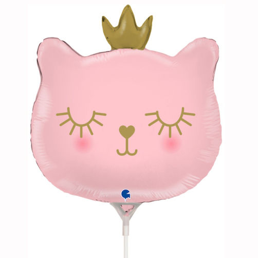 Folienballon am Stab - luftgefüllt - rosa Katze mit Krönchen - 35 cm
